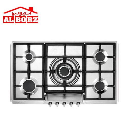گاز رومیزی کد S5957 استیل البرز دارای 5 شعله که شامل 1 شعله کوچک, 2 شعله متوسط , 1 شعله بزرگ و 1 شعله پلوپز است.